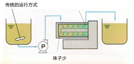 傳統(tǒng)磨機的運行方式 1、粒度難以控制,分散不充分; 2、粒度分布往往較寬; 3、無法控制物料的溫度; 4、在大流量高速運轉(zhuǎn)時,磨介易聚集在腔體一側(cè),容易堵塞在出料口。 |